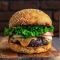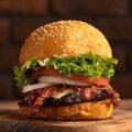 A piece of chuck meat topped with two slices of crispy bacon, tomatoes, lettuce, onions, American cheese, and chuck sauce.